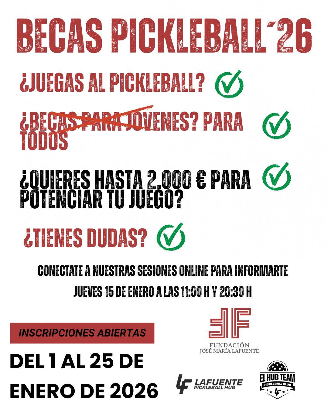 Queremos agradecer la increíble acogida que ha tenido nuestra convocatoria de becas. Hemos recibido un volumen de solicitudes que supera todas nuestras expectativas, lo que demuestra que el talento y la pasión por el pickleball en nuestra comunidad no dejan de crecer. ¡Gracias a todos por vuestras Ganas, Ilusión y Compromiso!