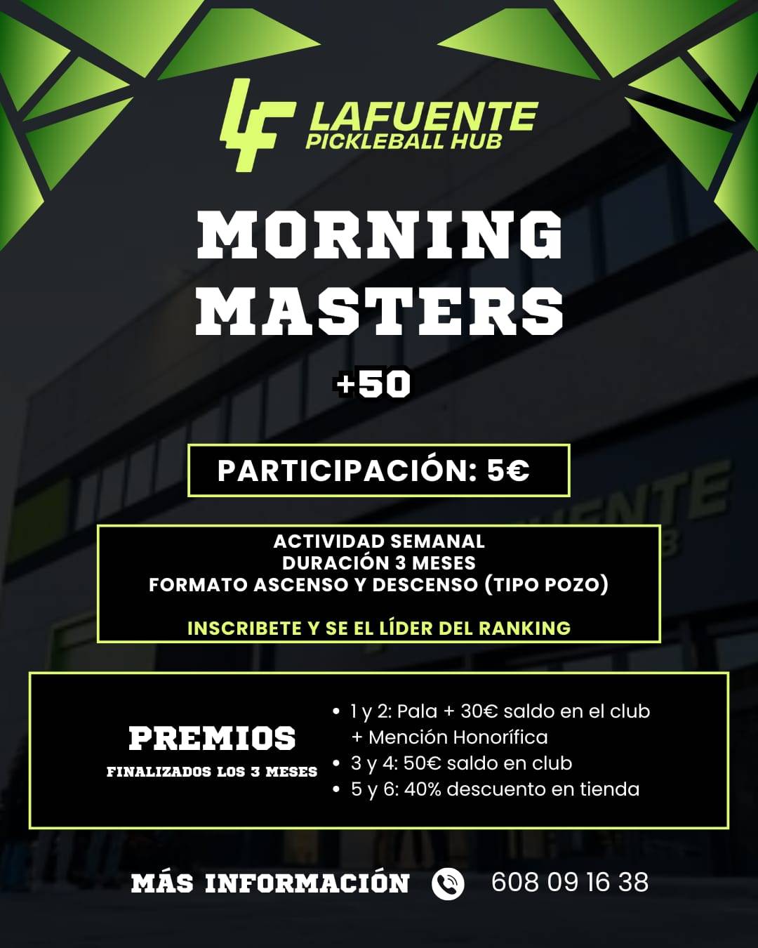 Lafuente Pickleball Hub presenta una nueva propuesta para los amantes del deporte y la competición matinal: “Morning Masters”, un circuito especialmente diseñado para jugadores mayores de 50 años que combina deporte, diversión y espíritu de comunidad.